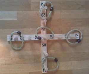 Règle du jeu en bois : Le premier joueur prend tous les anneaux et les lance les uns après les autres en direction de la cible.